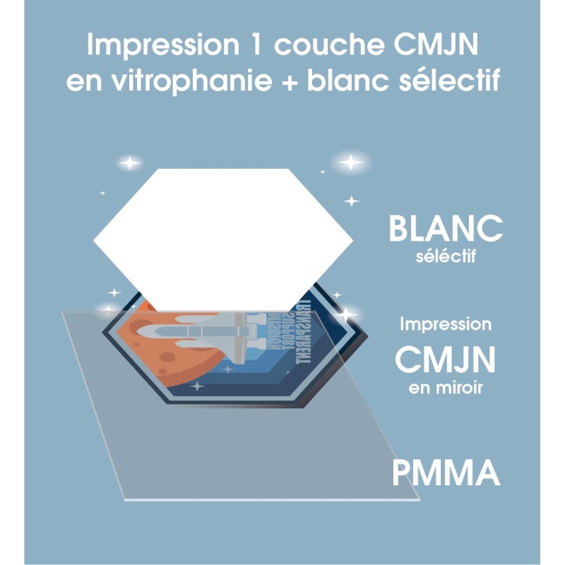 - Imprimer en vitrophanie avec un blanc en arrière.